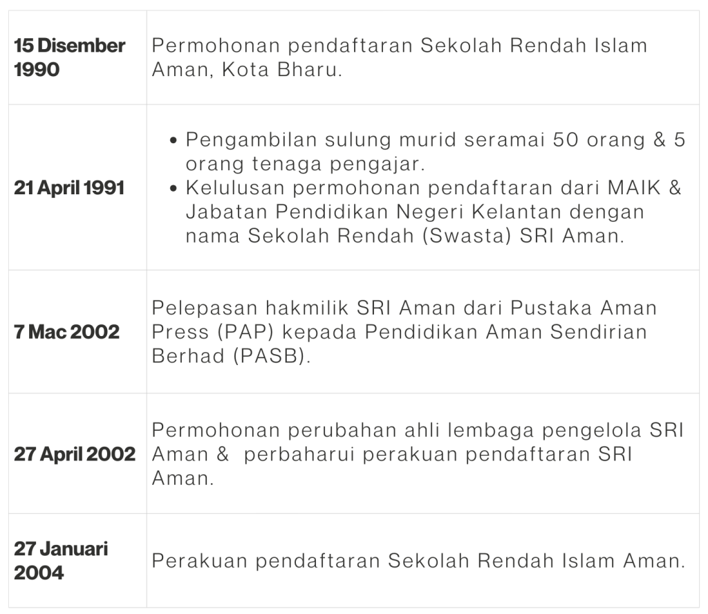 Sejak ditubuhkan sehingga sekarang, ribuan pewaris dan pemimpin generasi muslim telah melalui pendidikan dan tarbiah di SRI Aman Kota Bharu. Justeru, SRI Aman Kota Bharu komited untuk meneruskan proses pendidikan dan tarbiah ini untuk membina masa depan yang lebih baik untuk rakyat Malaysia.